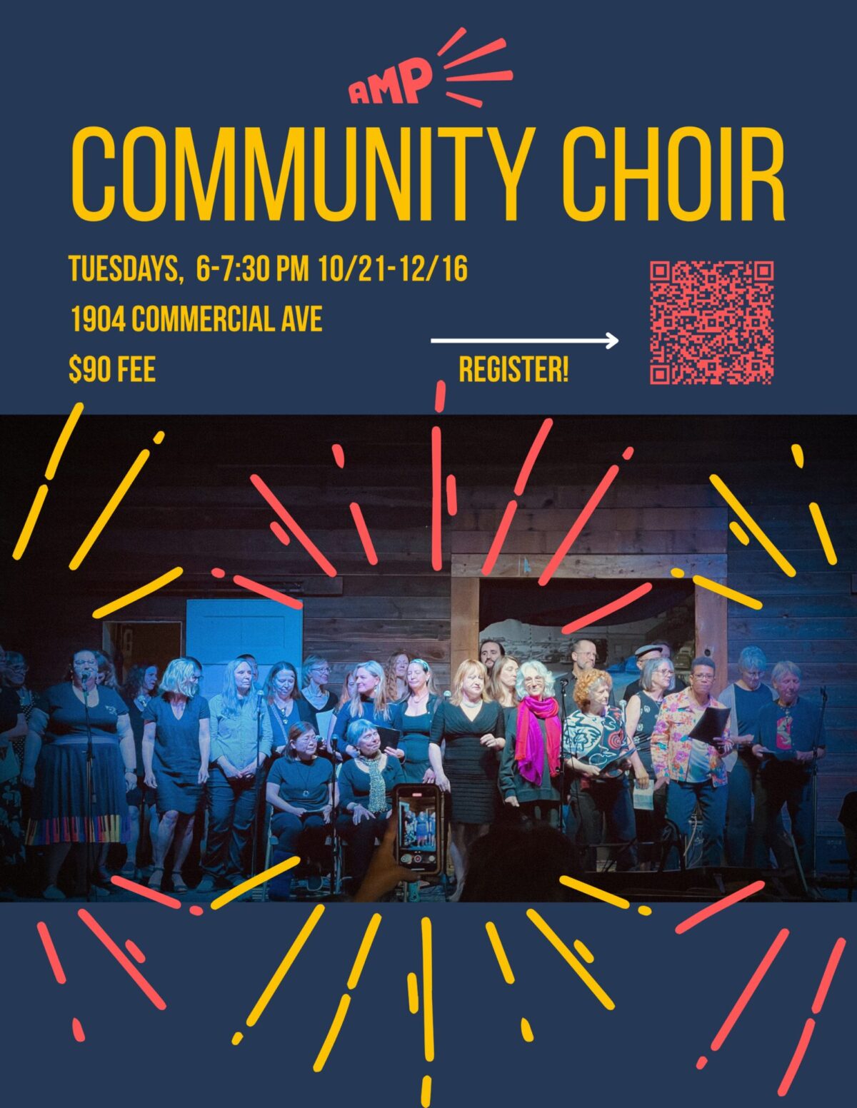 Our newest session of AMP’s Community Choir, led by our amazing director, Kathy Moore starts Oct 21st! Kathy is arranging some unique versions of holiday favorites for us to learn beautiful and rich harmonies. The final performance will be at AMP’s Rockin’ Yule Bizarre on December 20th.